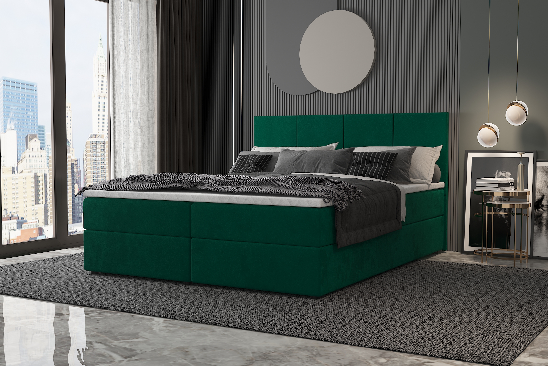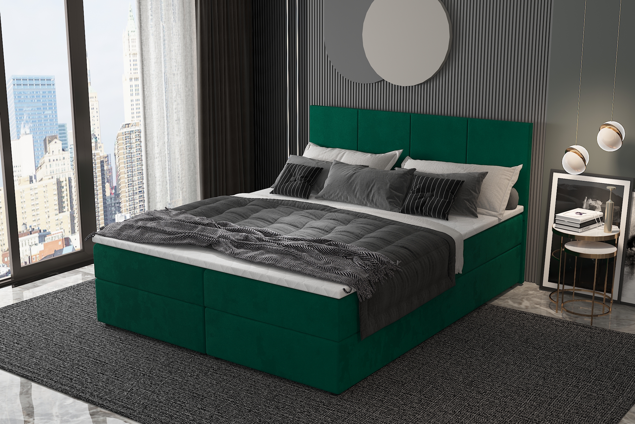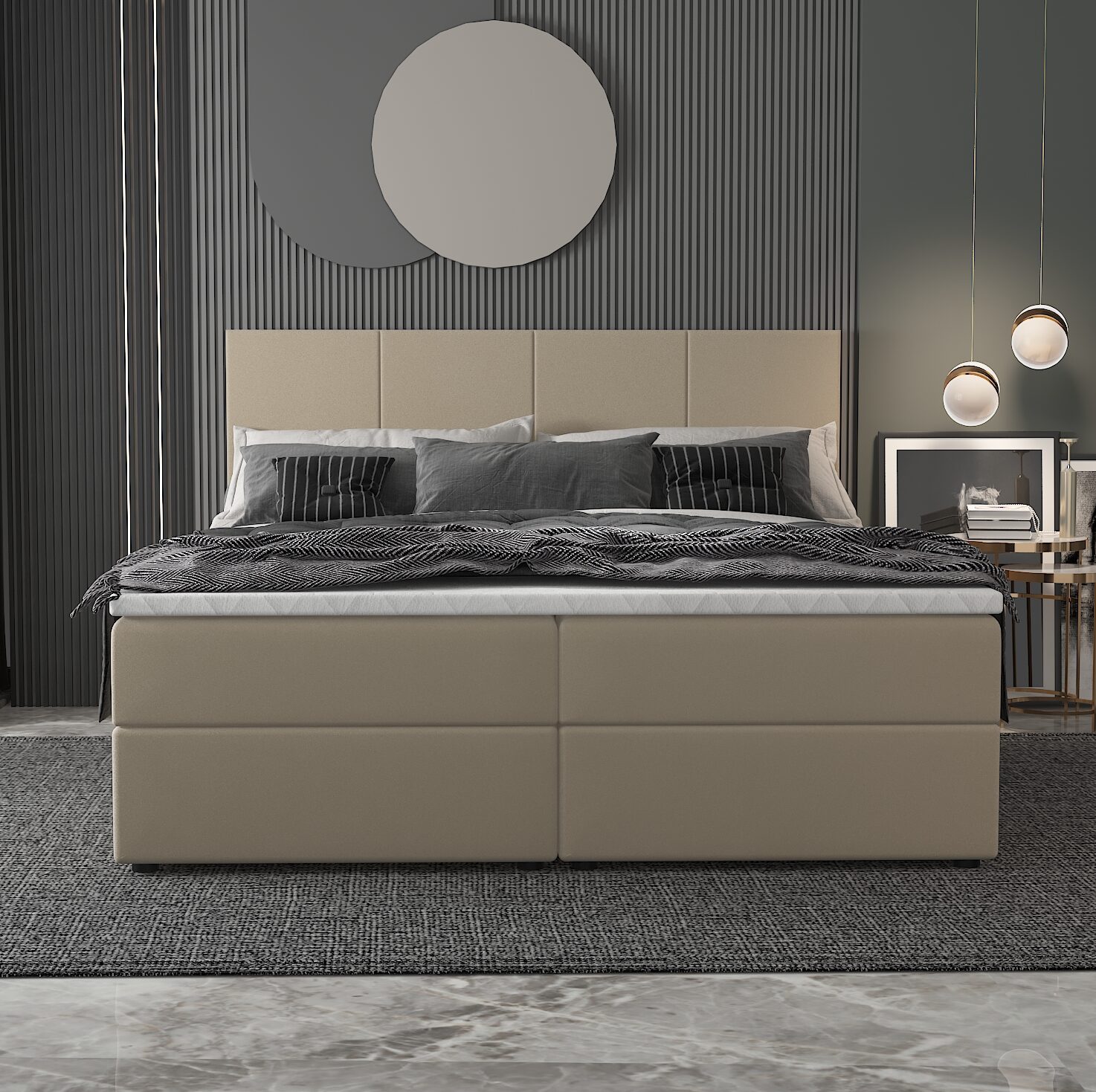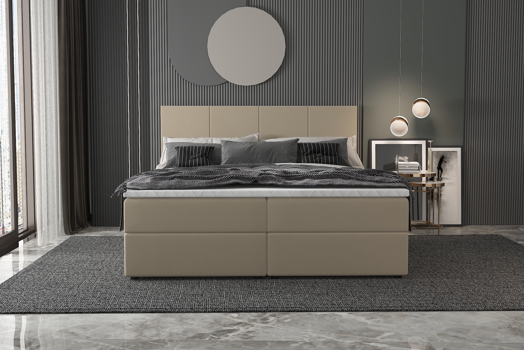 Łóżko kontynentalne MIRAGE tapicerowane to elegancki i funkcjonalny mebel, który łączy komfort z praktycznymi rozwiązaniami. Charakteryzuje się wysoką konstrukcją, składającą się z kilku warstw, co zapewnia wyjątkową wygodę podczas snu. Tapicerka dodaje mu stylowego wyglądu, a pionowe przeszycia na wezgłowiu podkreślają nowoczesny design, nadając wnętrzu elegancki charakter.