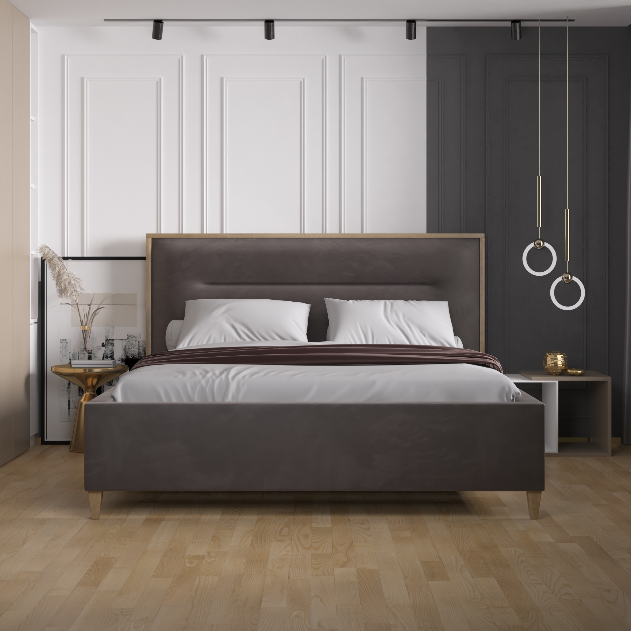 Na szczególną uwagę zasługuje gustowny zagłówek, z ozdobę listwą w naturalnej okleinie dębowej,